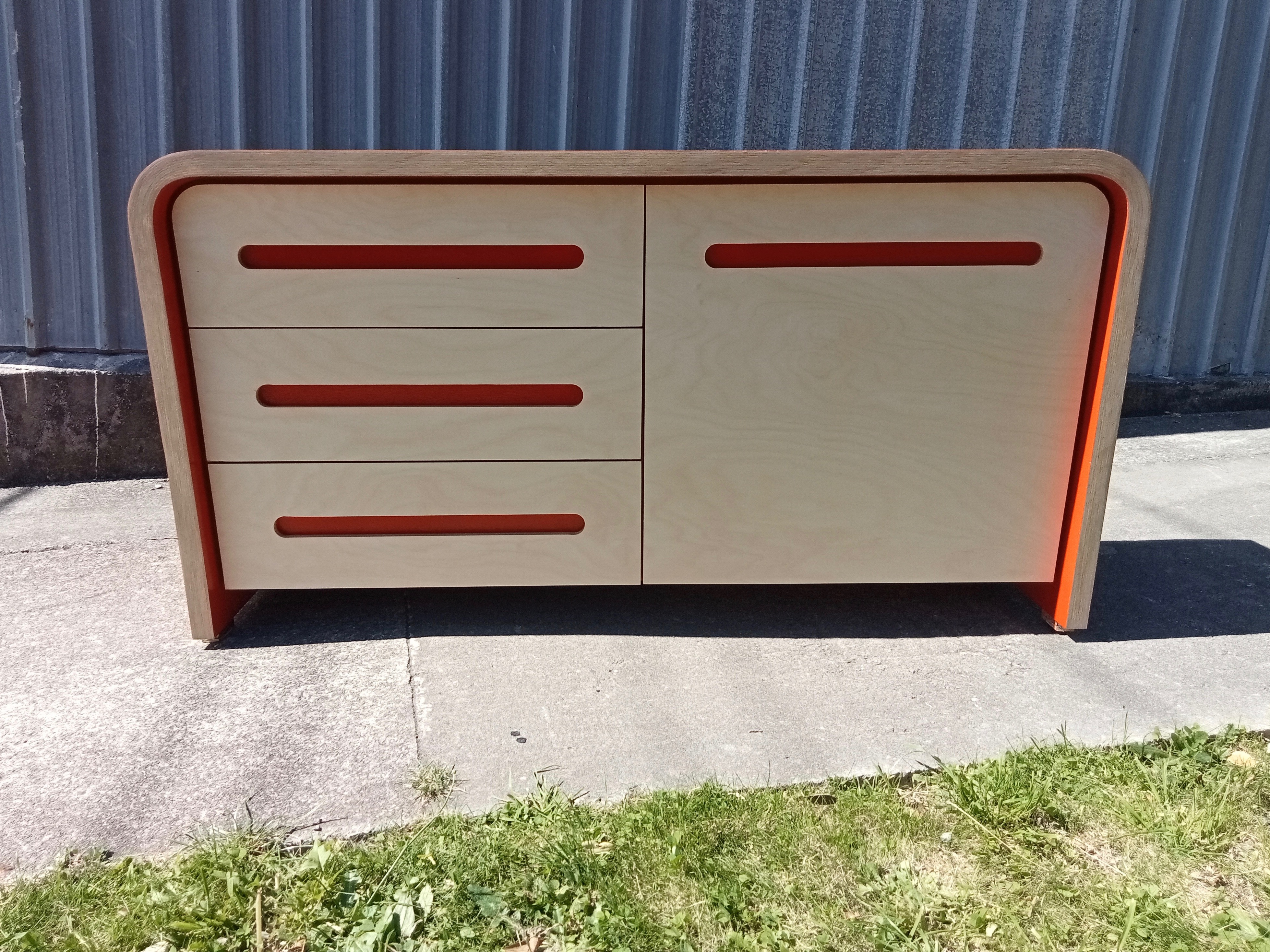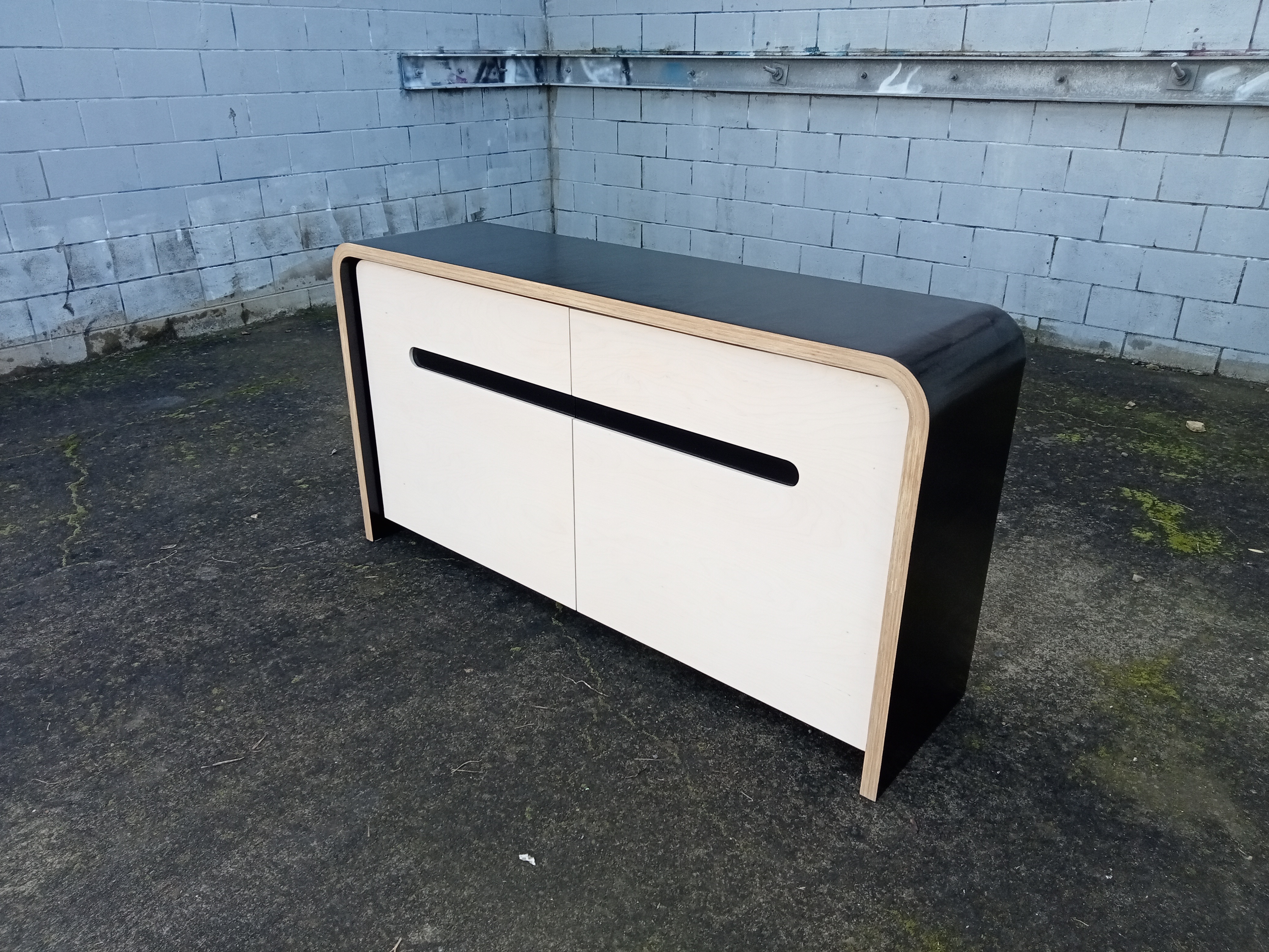The 1st Valorous Storage Unit shown measures 1700mm wide, 900mm high and 450mm deep. Coloured with Resene ‘Pitch Black; wood stain and finished with Resene polyurethane. On this unit the cabinet doors are stained with Resene ‘Rock Salt’ (white) before being Polyurethaned. Adjustable shelves are positioned behind the doors. The 2nd unit shown features three drawers on the left, and a cabinet door on the right. Adjustable shelves sit behind the cabinet door. Materials: 18mm Birch Plywood drawer and cabinet door fronts. Laminated 3mm Bendy plywood form the 'wrap around' edging, top and sides. 12 mm Plywood forms the construction of the Drawers. The unit is coloured with Resene 'Satin Orange' wood stain and a satin polyurethane finish. Dimensions 1500mm wide, 750mm high, 450mm deep (dimensions can be changed to suit) Please contact to discuss your ideas!